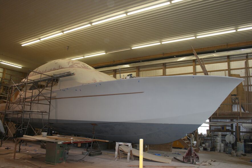 The F&S hull layup process utilizes three layers of half-inch Okume plywood on the bottom with an extra inch for good measure in the engine room and bulkheads and a layer of biaxial fiberglass between the second and third layer of Okume. This gives extra strength to stress points and the boat’s heavy machinery.